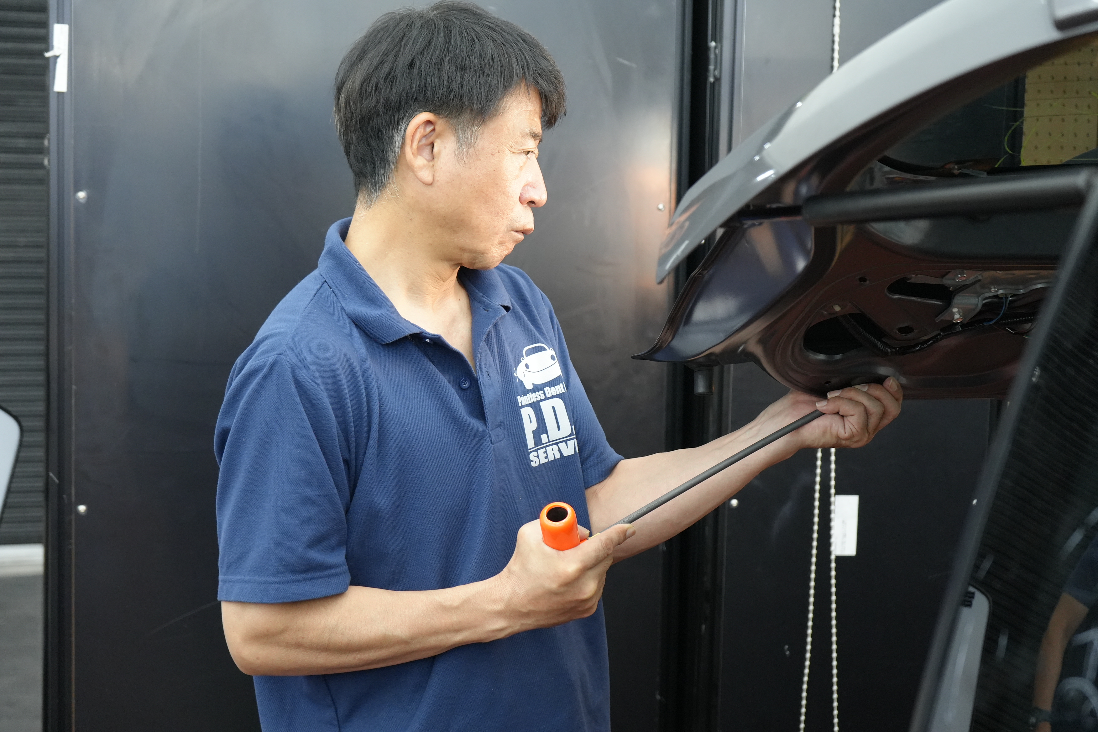 デントリペアは数十本の特殊専用ツールを使い分け、車のボディにできた凹みの裏側からゆっくり丁寧に押し上げることで、塗装することなく短時間で安価に、とても綺麗に仕上げることができます。